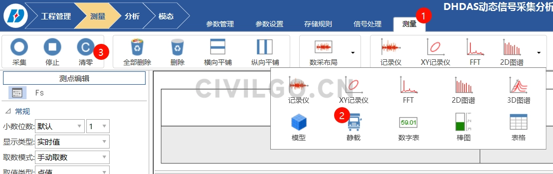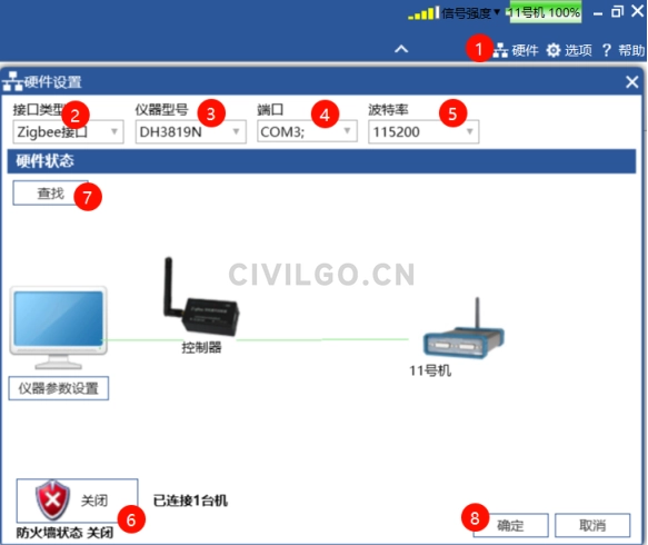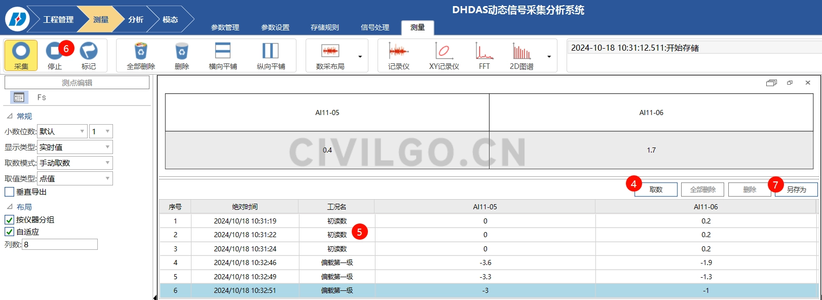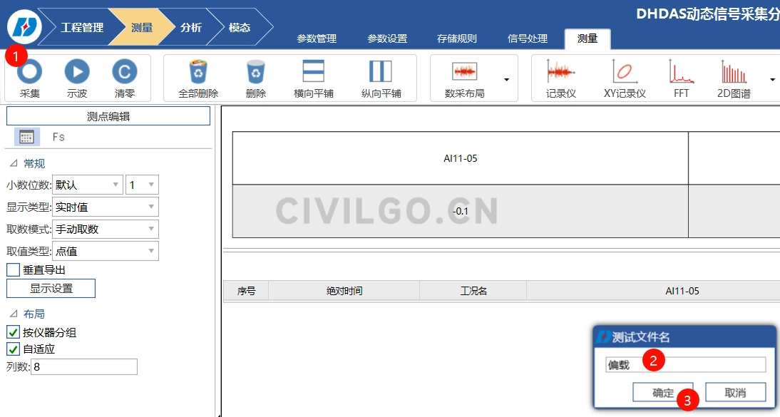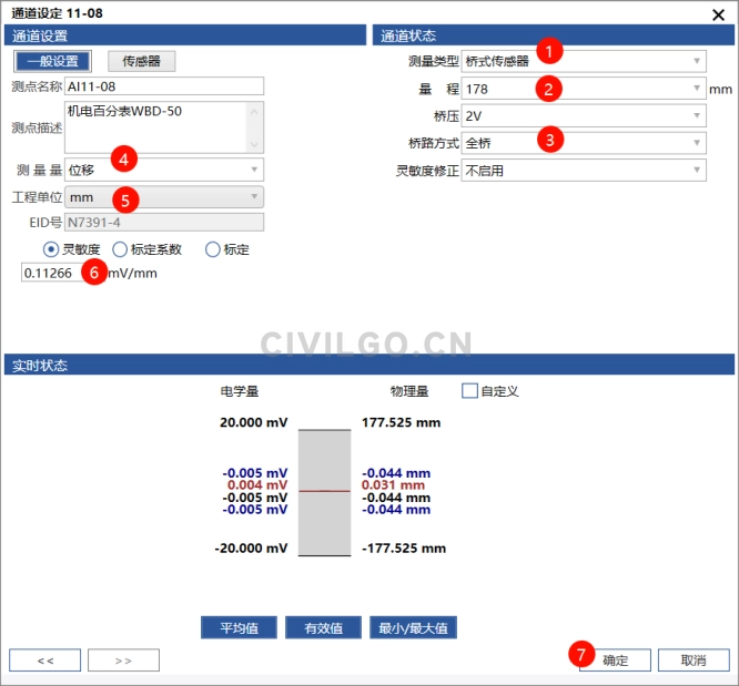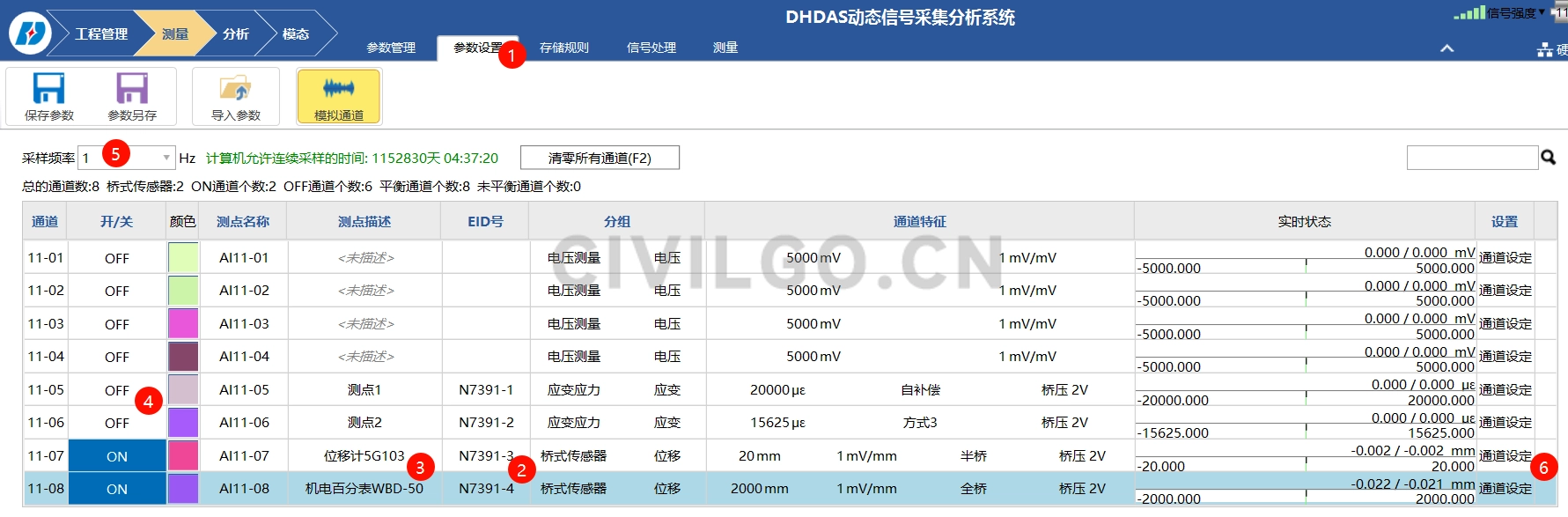 Bin 1.WBD-50接线方式 WBD-50导线颜色红色黑色绿色白色 DH5908N与导线颜色对应的接口+EgVi+Vi--Eg 注:+Eg表示供桥电压正极、-Eg表示供桥电压负极、Vi+表示信号正极、Vi-表示信号负极。 2.DH5908N安装调试与操作步骤 步骤图示说明 步骤一:试验前应通过短按设备侧面的电源按钮查看电量情况,应确保剩余电量足够完成荷载试验。电量显示灯:可指示仪器剩余电量,由4格指示灯组成,依次表示100%,75%,50%,25%剩余电量。 步骤二:连接设备与接线端子。如图所示,将信号输入线(接线端子)接入通道。信号输入线为DB接插件,在与通道连接时对准之后再插入,以免将插头中的针插弯。在插好插头后,请将两侧的紧固螺钉旋紧,确保连接可靠。 步骤三:连接设备与计算机按照图示将ZigBee无线通讯控制器接入计算机,长按电源按钮将设备开机。 步骤四:在软件端查找并连接设备1、打开软件后,点击右上角的【硬件】按钮。2、在弹出的窗口中,接口类型选择【网络接口】。3、仪器型号选择【DH5908N】。4、点击查找按钮查找设备,显示如图所示的内容时,表示设备已正常连接。 步骤五:新建项目1、点击【新建】按钮。2、在弹出的窗口中,输入或选择项目保存路径。3、输入项目名称。4、保存项目。注:完成上述操作后,会在指定路径下出现一个以项目名称命名的文件夹,后续所有测试工况的测试数据都将保存在该文件夹中。 步骤六:查看并记录每一个测点对应的EID编号如图所示,已经接线的两个测点对应的EID编号分别为N7391-1、N7391-2。总的来说,这一步就是为了搞清楚设备的每一个通道与测点的对应关系,可以选择自己习惯的方式。 步骤七:通道设置1、进入测量模块的参数设置界面。2、通过EID号找到每一个测点在软件中对应的通道。3、在测点描述处填入对应的测点编号。4、关闭未用到的通道。5、设置采样频率。6、点击【通道设定】,对通道参数进行详细设置。 步骤八:参数设置1、测量类型选择【桥式传感器】。 2、量程可按需进行选择。 3、桥路方式选择【半桥】。 4、测量量选择【位移】。 5、工程单位选择【mm】。 6、灵敏度系数根据采用的传感器实际情况进行设置。 步骤九:平衡清零1、点击【测量】按钮进入测量界面。2、点击【静载】按钮,进入静载试验采集界面。3、点击【清零】按钮,对各通道进行平衡清零。观察清零后的各通道实时数据,当各通道读数均稳定为0或在0上下小幅度波动时,表示传感器及采集系统已就绪,可以进行下一步试验。如果存在数据波动幅度较大或读数持续增大/减小的通道,应排查传感器粘贴、接线等是否存在异常。 步骤十一:数据采集 1、点击【采集】按钮。2、在弹出的窗口中输入工况名称。3、保存测试文件。4、每级加载完毕后,点击【取数】按钮读取各测点数据,通常建议每级取数三次。5、取数完毕后修改工况名。6、试验完毕后点击【停止】按钮停止采集。7、点击【另存为】将试验数据另存为“.xlsx”格式文件。